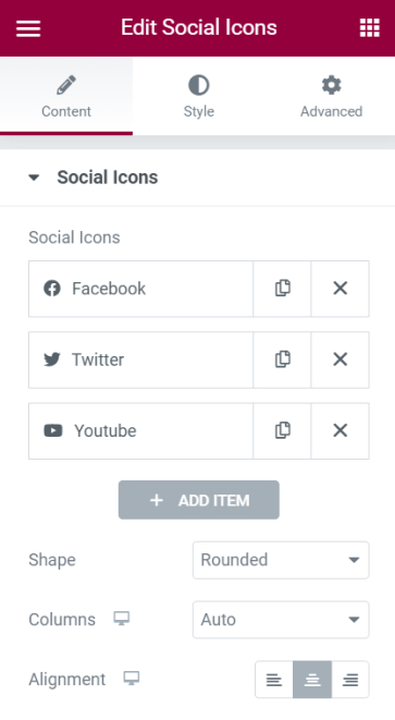 - Alignment - Set the alignment for the social icons to either be positioned Left, Center or Right