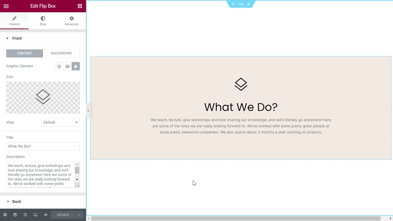 The backside of the flip box element will contain the same elements as the front side. They are also divided into two tabs, the Content and Background tab. The graphic element will appear only on the front side of the flip box, but the backside will also contain exclusive elements