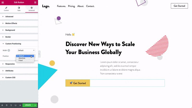 - Scroll down to Positioning and choose Fixed from the dropdown menu.